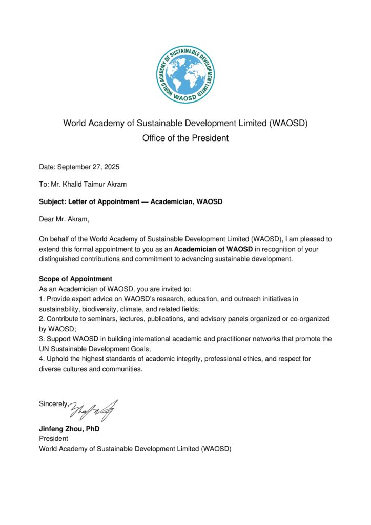 On 27th September 2025, the World Academy of Sustainable Development Limited (WAOSD), China formally appointed Mr. Khalid Taimur...