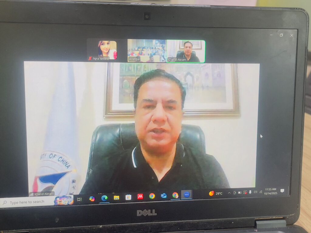 Prof. Li Huailiang, Dean of the Institute for a Community with Shared Future (ICSF), Communication University of China (CUC), Beijing, gave an online speech in which he extended warm greetings to all participants, introduced the Institute for a Community with Shared Future (ICSF), and emphasized the significance of the Fellowship Program, the Belt and Road Initiative (BRI), and the role of young scholars in promoting Pakistan–China friendship. He described the young fellows as “ambassadors of friendship” between the two nations.