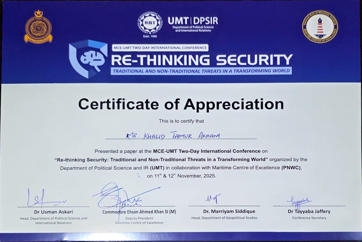 Mr. Khalid Taimur Akram, Executive Director of the Pakistan Research Center for a Community with Shared Future (PRCCSF), participated as a distinguished speaker at the MCE–UMT Two-Day International Conference on “Re-thinking Security: Traditional and Non-Traditional Threats in a Transforming World.” The conference, jointly organized by the Department of Political Science & IR (UMT) and the Maritime Centre of Excellence (PNWC), was held on 11–12 November 2025 at Lahore.