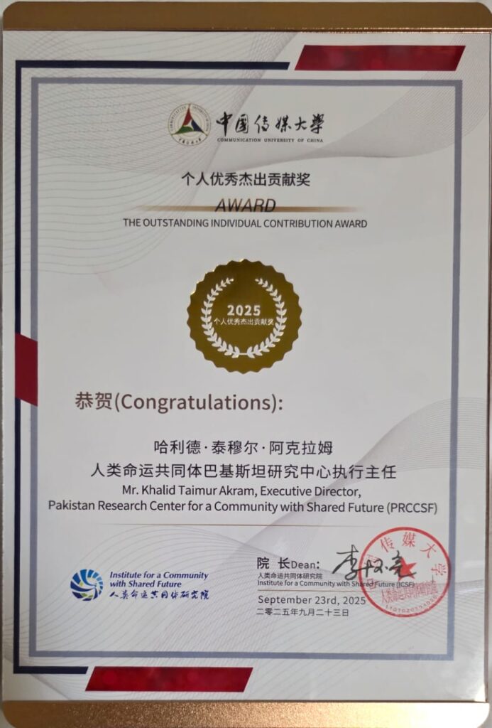 On 23rd September 2025, Mr. Khalid Taimur Akram was honored with the prestigious “Outstanding Individual Contribution Award 2025” by the Communication University of China, Beijing. This marked the fifth consecutive year (2021–2025) that he received this esteemed award, making him one of the very few scholars consistently recognized across multiple years.
