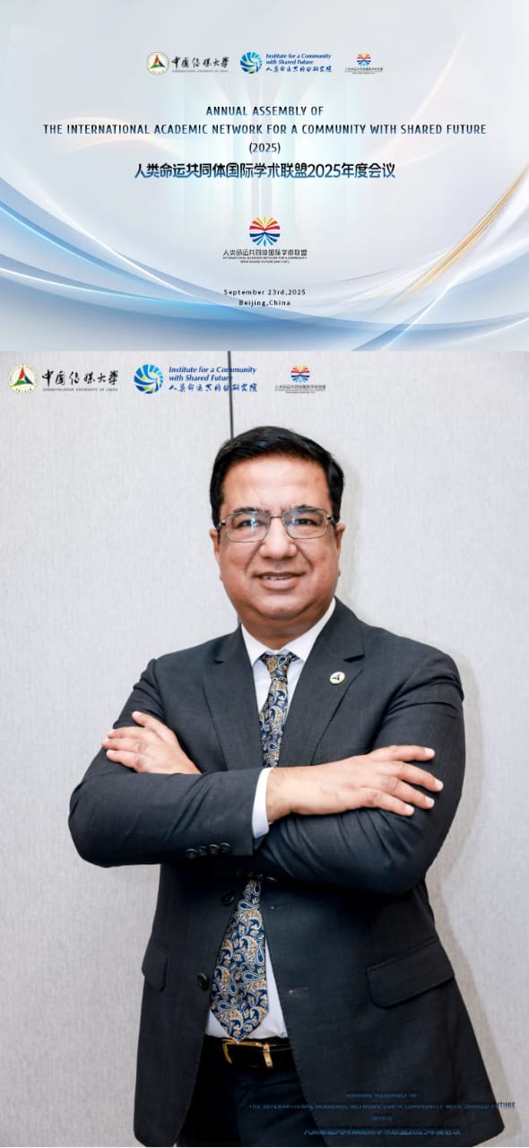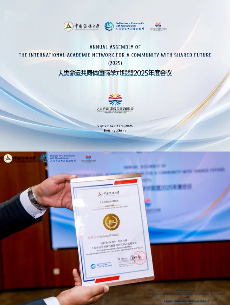 The honor was conferred during the Annual Assembly of the International Academic Network for a Community with a Shared Future, held at the Communication University of China, Beijing. The Assembly was chaired by Professor Li Huailiang, Dean of the Institute for a Community with Shared Future (ICSF), Communication University of China (CUC), Beijing, who commended Mr. Khalid Taimur Akram for his outstanding contributions and tireless efforts in enhancing global support for the concept of a shared future. This recognition not only highlighted his personal achievements but also reflected the growing appreciation of Pakistan’s intellectual engagement in international academic and policy-oriented discourse.